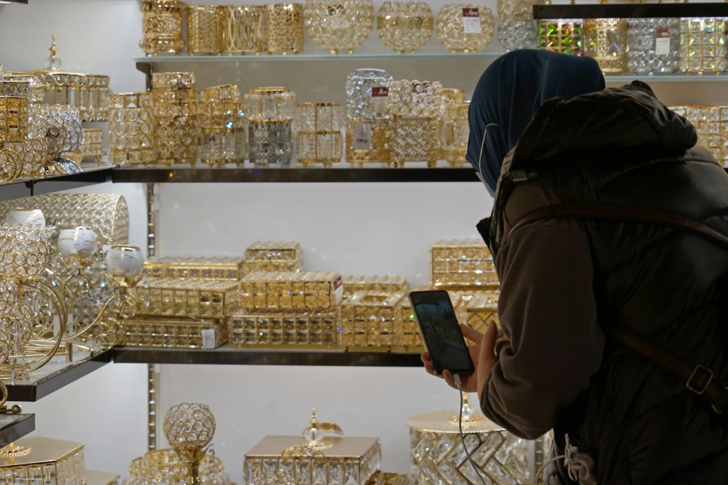 義烏國際商貿城一家水晶商鋪內,業(yè)務員小丁正在貨架前進行遠程視頻連線,手機的另一頭連著巴勒斯坦。受疫情影響,海外客商來華不便,遠程直播成為其采購之“眼睛”。“客戶擔心這個燈臺尺寸比較大,運費會不會比較貴?”業(yè)務員小丁問?!皼]問題,主體和燈座可以拆卸,包裝不占空間?!鄙啼佖撠熑藙s斌立即回復。