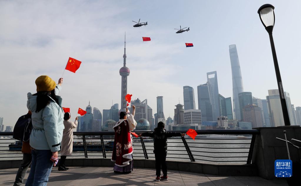 兩架懸掛國旗和警旗的警航直升機(jī)飛過上海外灘,慶祝首個(gè)“中國人民警察節(jié)”(2021年1月10日攝)。新華社記者 方喆 攝