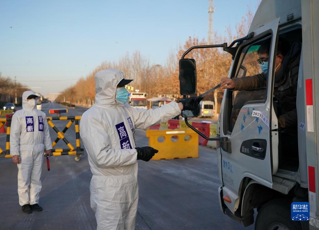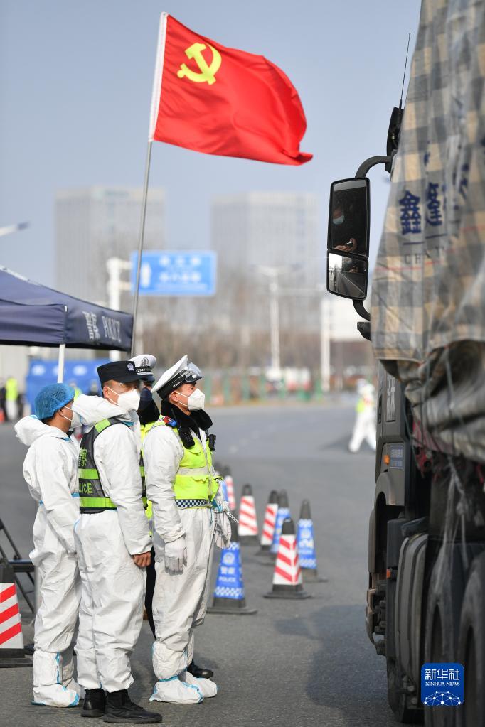 石家莊市公安局高新技術(shù)產(chǎn)業(yè)開發(fā)區(qū)公安分局民警在藁城區(qū)通往市區(qū)的路口執(zhí)勤(2021年1月10日攝)。當(dāng)日是首個(gè)“中國人民警察節(jié)”。新華社記者 楊世堯 攝