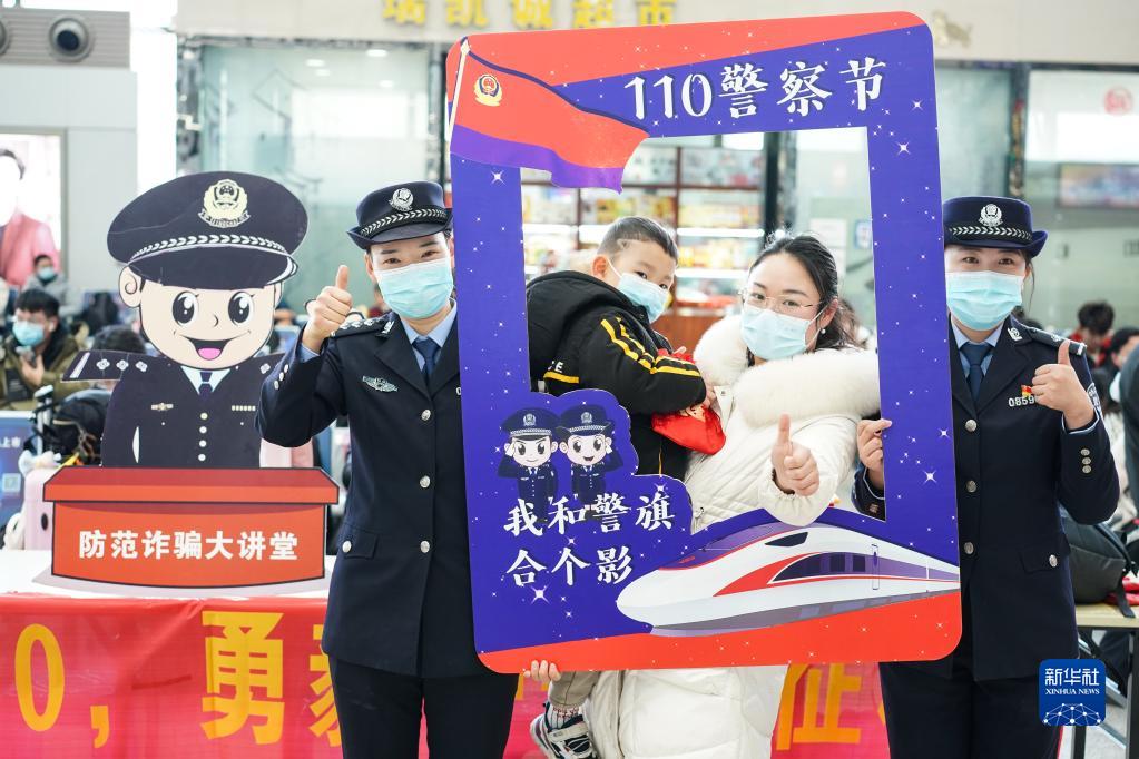 南京鐵路公安處聯(lián)合南京市公安局公交治安分局在南京火車站舉行迎接“中國人民警察節(jié)”活動(dòng),民警和旅客在活動(dòng)上合影(2022年1月7日攝)。新華社記者 季春鵬 攝