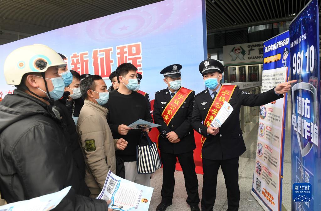 在廣西南寧東站,南寧鐵路公安處民警向旅客宣傳防電信詐騙常識(shí)(2022年1月9日攝)。新華社記者 陸波岸 攝