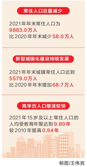 高學(xué)歷人口增速較快。2021年,全省15歲及以上常住人口的人均受教育年限達(dá)到9.89年,較2020年提高0.10年,較2010年提高0.94年。同時(shí),全省常住人口中,每10萬人中擁有大學(xué)(指大專及以上)文化程度的人口為12244人,高中(含中專)15739人,初中36619人,小學(xué)24821人。大學(xué)(指大專及以上)文化程度的人口增長最快。(記者 李鵬)