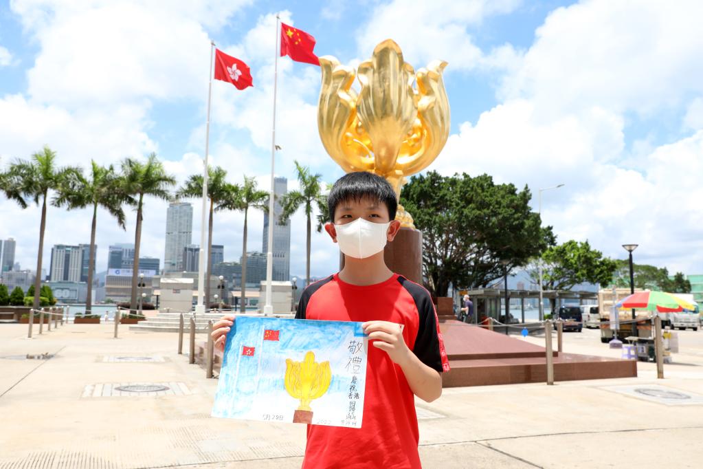 香港小學(xué)生曾祥珂帶著自己的畫(huà)作《敬禮——慶祝香港回歸25周年》,在父母陪伴下來(lái)到金紫荊廣場(chǎng)留影,迎接香港回歸25周年。新華社記者 吳曉初 攝