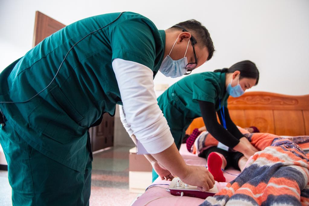 2021年11月12日,在湖南省長(zhǎng)沙市長(zhǎng)沙縣果園鎮(zhèn)楊泗廟社區(qū),醫(yī)務(wù)人員彭永(左)、劉敏給居家老人做理療。新華社記者 陳思汗 攝