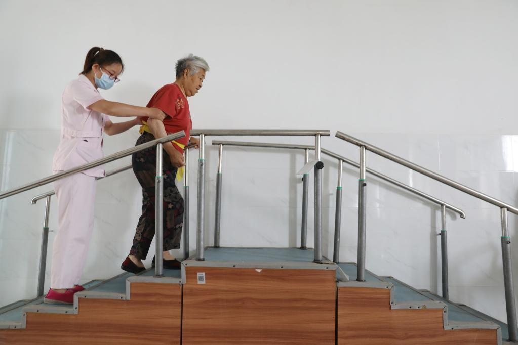 2021年7月3日,在河南省焦作市溫縣養(yǎng)老護(hù)理院醫(yī)養(yǎng)中心,一名醫(yī)護(hù)人員幫助一名老人進(jìn)行康復(fù)訓(xùn)練。新華社發(fā)(徐宏星 攝)