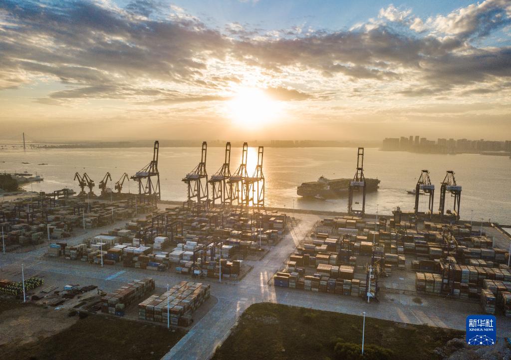 這是2021年12月5日清晨在海南自貿(mào)港重點園區(qū)洋浦經(jīng)濟開發(fā)區(qū)拍攝的洋浦國際集裝箱碼頭(無人機照片)。新華社記者 蒲曉旭 攝