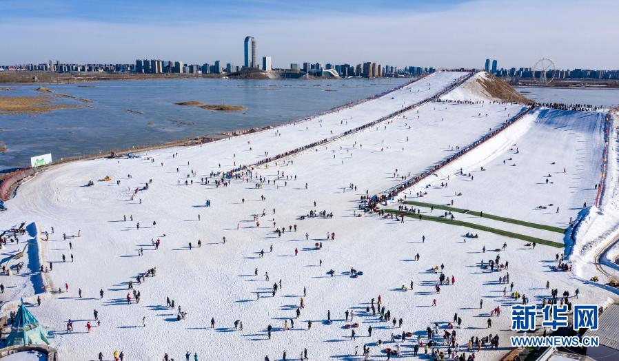 這是2021年1月30日,市民在寧夏銀川市閱?;﹫鲶w驗(yàn)冰雪項(xiàng)目(無人機(jī)照片)。新華社記者 馮開華 攝