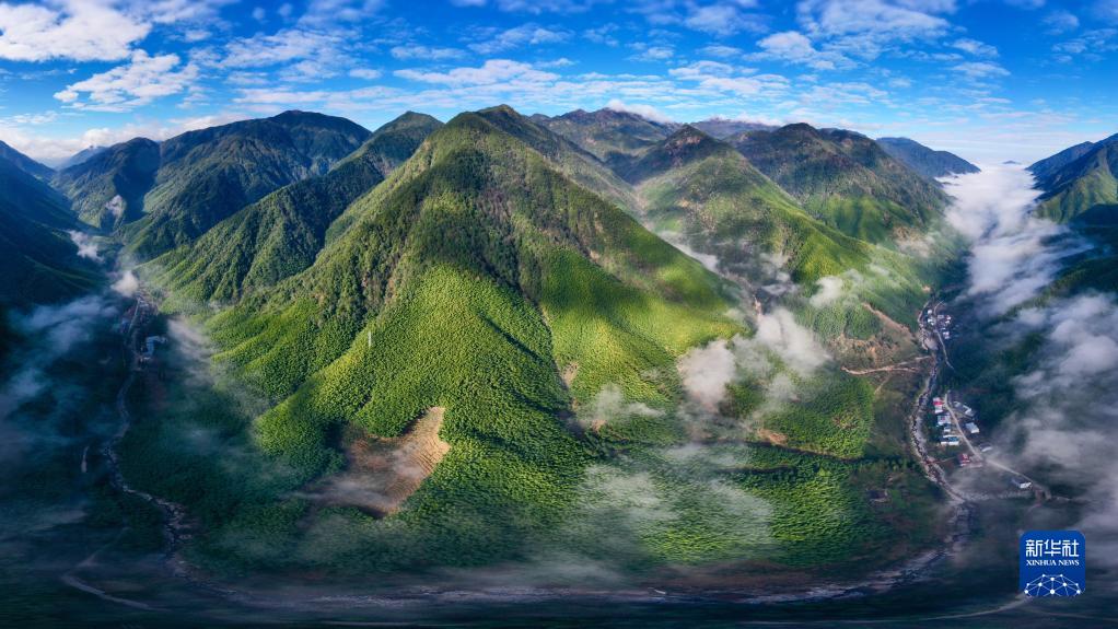 武夷山國家公園武夷斷裂帶峽谷內(nèi)云霧繚繞,村莊若隱若現(xiàn)(2020年12月1日攝,無人機照片)。新華社記者 姜克紅 攝