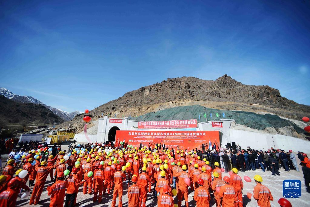 這是2016年2月27日在烏茲別克斯坦“安格連-帕普”鐵路卡姆奇克隧道出口拍攝的全隧貫通儀式現(xiàn)場。新華社記者 沙達(dá)提 攝
