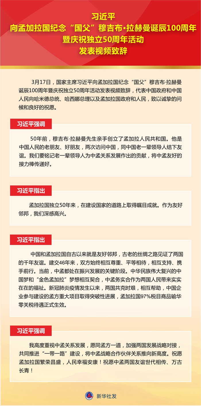 新華社北京 3 月 17 日電 3 月 17 日,國家主席習(xí)近平向孟加拉國紀(jì)念 “ 國父 ” 穆吉布 · 拉赫曼誕辰 100 周年暨慶祝獨立 50 周年活動發(fā)表視頻致辭,代表中國政府和中國人民向哈米德總統(tǒng)、哈西娜總理以及孟加拉國政府和人民,致以誠摯的問候和良好的祝愿。