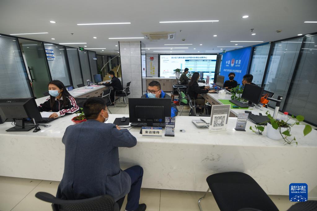 社區(qū)居民在浙江省湖州市吳興區(qū)飛英街道矛盾糾紛調(diào)處化解中心進行咨詢登記(2022年4月28日攝)。新華社記者 徐昱 攝