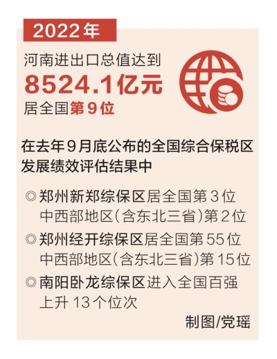 2022年,河南進(jìn)出口總值在高基數(shù)上穩(wěn)定增長(zhǎng),達(dá)到8524.1億元,居全國(guó)第9位。其中,鄭州新鄭、鄭州經(jīng)開(kāi)、南陽(yáng)臥龍、洛陽(yáng)四個(gè)綜保區(qū)對(duì)全省進(jìn)出口總值的貢獻(xiàn)率超60%。