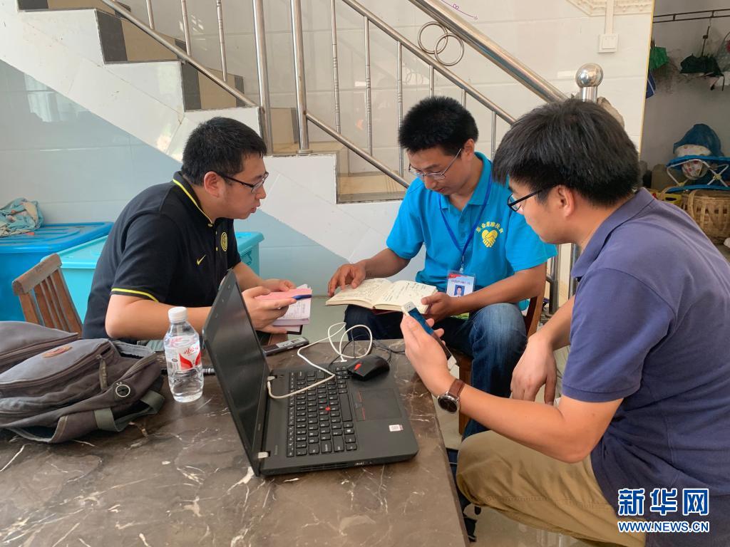 記者何偉(右一)與同事采訪廣西百色市樂(lè)業(yè)縣百坭村新任駐村第一書(shū)記楊杰興(中)(2019年7月31日攝)。新華社記者 徐海濤 攝