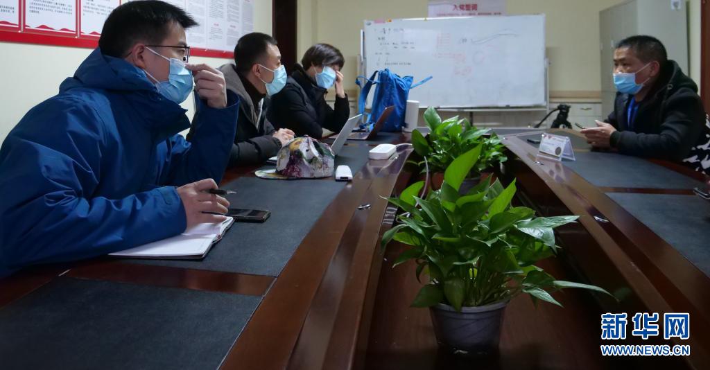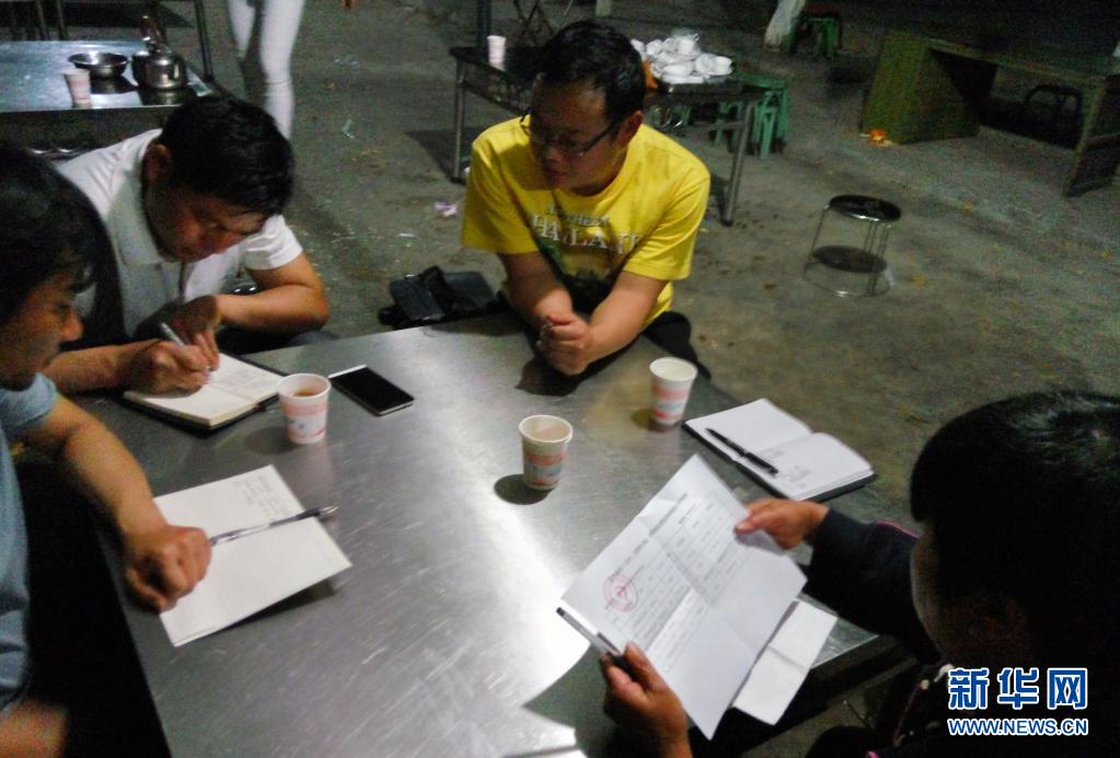 吳國(guó)良(右二)與扶貧干部交流工作進(jìn)展(資料照片)。新華社發(fā)