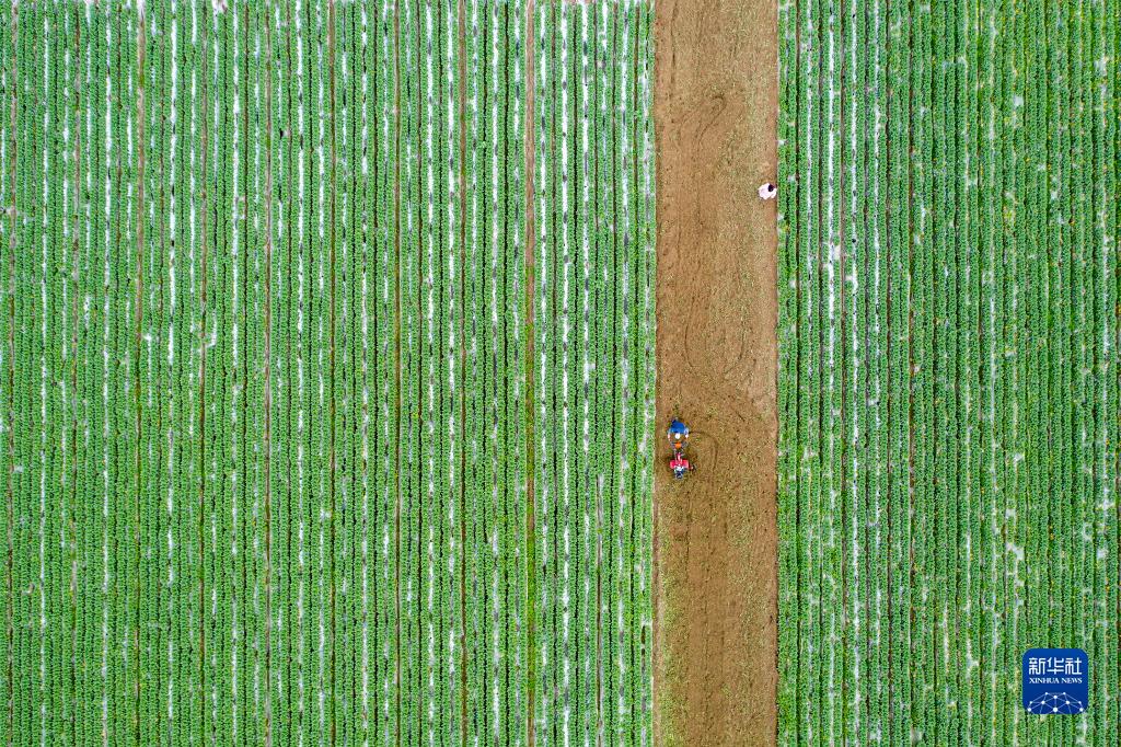 在四川省閬中市彭城鎮(zhèn),村民駕駛農(nóng)機翻耕菜地(2月23日攝,無人機照片)。新華社發(fā)(王玉貴 攝)