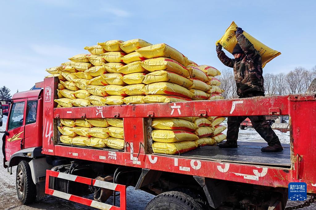 北大荒集團五大連池農(nóng)場科技服務(wù)中心工人在裝運肥料(2月16日攝)。新華社發(fā)(陸文祥 攝)