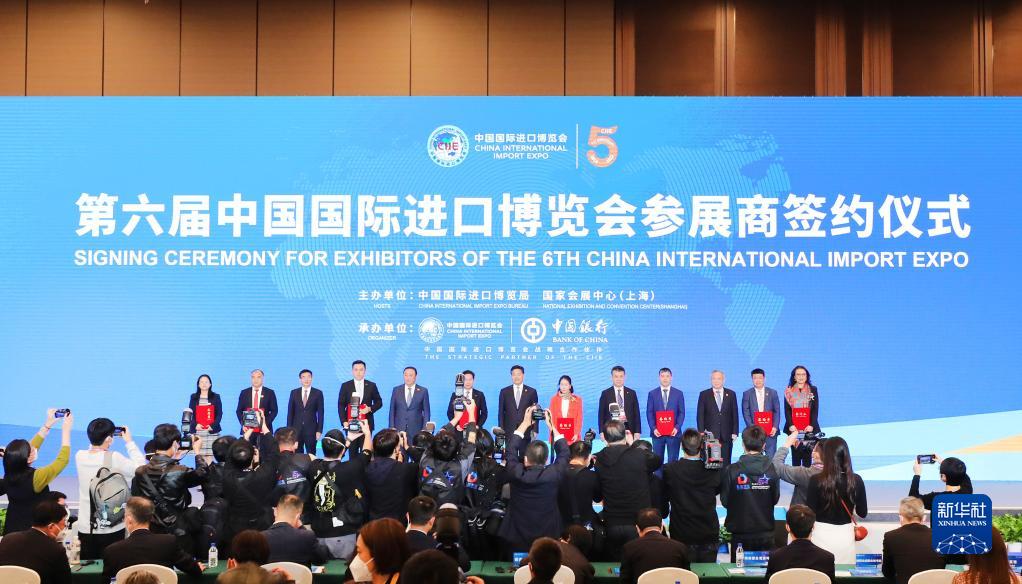 2022年11月6日,2022年中國國際進口博覽會參展商聯(lián)盟大會在上海舉行。這是在大會期間進行的第六屆進博會參展商簽約儀式。新華社記者 方喆 攝