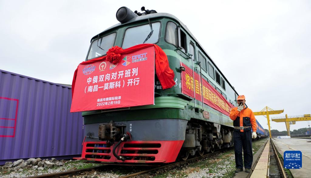2022年江西首列中俄雙向?qū)﹂_班列(南昌—莫斯科)在南昌向塘國際陸港準備出發(fā)(2022年2月19日攝)。新華社記者 彭昭之 攝