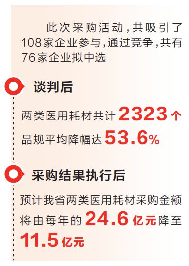 此次采購活動,共吸引了108家企業(yè)參與,其中,國內(nèi)企業(yè)70家、外資企業(yè)38家。通過前期充分調(diào)研,會中集中開標(biāo)、兩輪談判等公平競爭環(huán)節(jié),共有76家企業(yè)擬中選。談判后,兩類醫(yī)用耗材共計2323個品規(guī)平均降幅達(dá)53.6%。采購結(jié)果執(zhí)行后,預(yù)計我省兩類醫(yī)用耗材采購金額將由每年的24.6億元降至11.5億元。