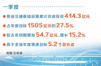 這是我省全力推動交通重點項目建設加速提質增效的一個縮影。記者從當天召開的河南省交通運輸經濟運行調度會上獲悉,今年一季度,我省交通基礎設施累計完成投資414.3億元,占年度目標1505億元的27.5%,較去年同期增加54.7億元、增長15.2%,高于全省年度增速目標5.2個百分點。