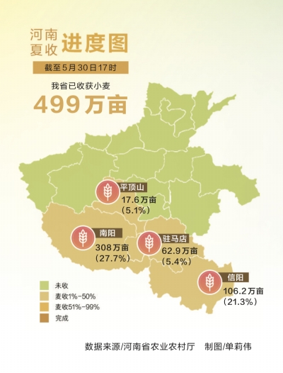 5月30日,天氣晴朗。在確山縣雙河鎮(zhèn)鄧莊村的一塊麥田里,兩臺(tái)收割機(jī)正在麥田里穿梭。