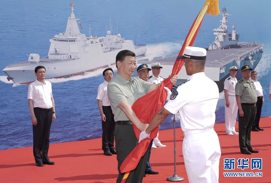 下午3時(shí)30分許,交接入列儀式開始,全場高唱中華人民共和國國歌,五星紅旗冉冉升起。儀仗禮兵護(hù)衛(wèi)著八一軍旗、命名證書,正步行進(jìn)到主席臺(tái)前。習(xí)近平將八一軍旗、命名證書分別授予長征18號(hào)艇艇長、政治委員,大連艦艦長、政治委員,海南艦艦長、政治委員。三型艦艇的艦艇長、政治委員向習(xí)近平敬禮,從習(xí)近平手中接過八一軍旗、命名證書。習(xí)近平同他們合影留念。