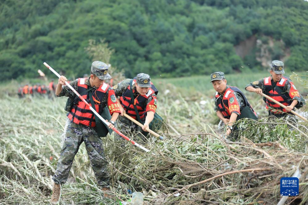 8月7日,陸軍第78集團軍某旅組織黨員突擊隊在吉林舒蘭市七里鄉(xiāng)清理路障。新華社發(fā) (劉洋 攝)