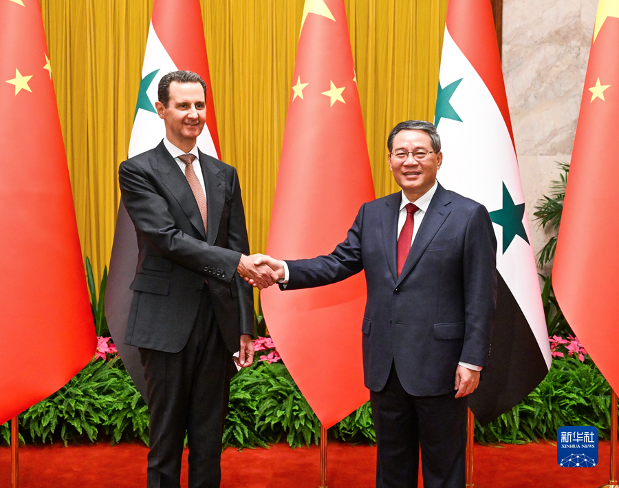 9月25日上午,國務(wù)院總理李強(qiáng)在北京人民大會(huì)堂會(huì)見來華出席杭州第十九屆亞洲運(yùn)動(dòng)會(huì)開幕式的敘利亞總統(tǒng)巴沙爾。新華社記者 饒愛民 攝