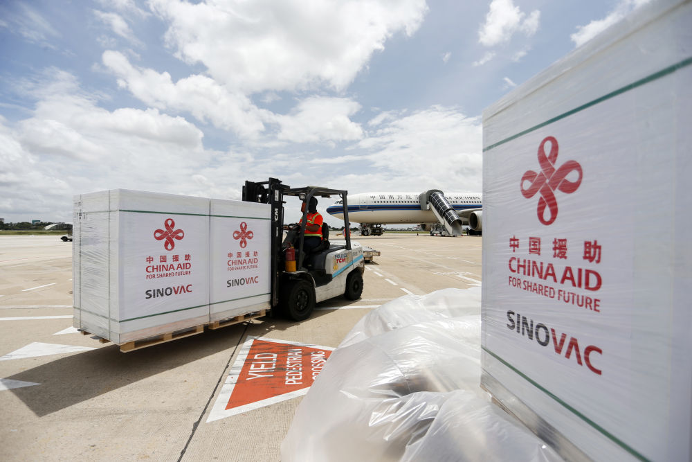 工作人員在柬埔寨金邊國際機場運輸中國政府援助柬埔寨的科興新冠疫苗(2021年10月14日攝)。新華社發(fā)(批隆攝)