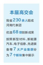 本屆高交會以“激發(fā)創(chuàng)新活力 提升發(fā)展質(zhì)量”為主題,是史上規(guī)模最大、參與國家和地區(qū)最多的一屆高交會。作為高交會的“老朋友”,省商務(wù)廳組織230余人組成河南代表團(tuán),在全省優(yōu)選了68項創(chuàng)新成果,按照新型材料、新能源汽車、電子信息、先進(jìn)裝備、現(xiàn)代食品、現(xiàn)代輕紡、現(xiàn)代醫(yī)藥等7大產(chǎn)業(yè)集群分為7個板塊集中展示,并攜旭陽光電、超聚變、力量鉆石、綠纖股份、未來星機(jī)器人等16家企業(yè)亮相。