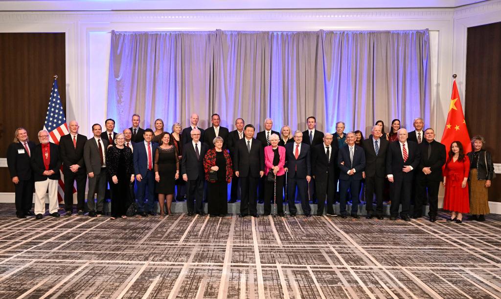 當(dāng)?shù)貢r(shí)間11月15日晚,國(guó)家主席習(xí)近平在美國(guó)舊金山出席美國(guó)友好團(tuán)體聯(lián)合舉行的歡迎宴會(huì)。這是宴會(huì)開始前,習(xí)近平會(huì)見(jiàn)飛虎隊(duì)和史迪威將軍后人、鼓嶺、艾奧瓦州、華盛頓州等方面友好人士代表,同他們親切交談并合影留念。