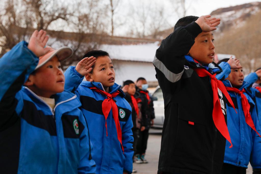 12月25日,積石山縣柳溝鄉(xiāng)陽山希望小學(xué)的學(xué)生在復(fù)課首日舉行升旗儀式。 新華社記者 方欣 攝