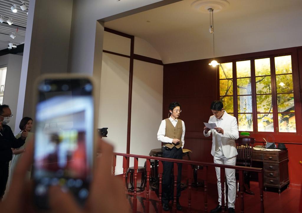 ??2023年5月18日晚,中共一大紀(jì)念館原創(chuàng)的情景黨課《又見新青年》在展廳內(nèi)實(shí)景演出。自2021年中國共產(chǎn)黨成立100周年之際全新開放以來,中共一大紀(jì)念館對(duì)紅色文化的創(chuàng)新傳播正不斷“圈粉”年輕人。新華社記者 劉穎 攝