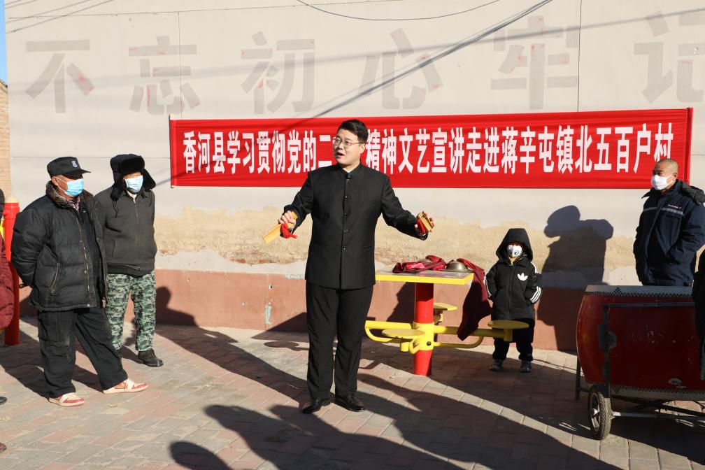 ??河北省香河縣文化館的文藝工作者張鑫銘在香河縣蔣辛屯鎮(zhèn)北五百戶村進(jìn)行黨的二十大精神“快板宣講”(2022年12月13日攝)。新華社發(fā)