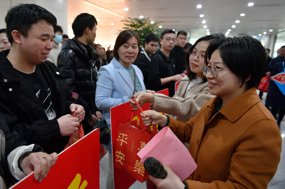2024年2月15日,福州市人社部門工作人員(前右)向乘坐包機(jī)抵榕的返崗務(wù)工人員送上新春大禮包。當(dāng)日,來(lái)自云南、貴州的364名返崗務(wù)工人員乘坐的飛機(jī)降落在福州長(zhǎng)樂(lè)國(guó)際機(jī)場(chǎng)。這是2024年春節(jié)后福州市人社部門通過(guò)免費(fèi)包機(jī)接回的首批重點(diǎn)企業(yè)返崗務(wù)工人員。新華社記者 魏培全 攝