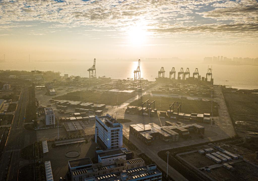 ??2024年1月1日在海南省洋浦經(jīng)濟(jì)開發(fā)區(qū)拍攝的海南自貿(mào)港集裝箱航運(yùn)樞紐——洋浦國際集裝箱碼頭(無人機(jī)照片)。新華社記者 蒲曉旭 攝