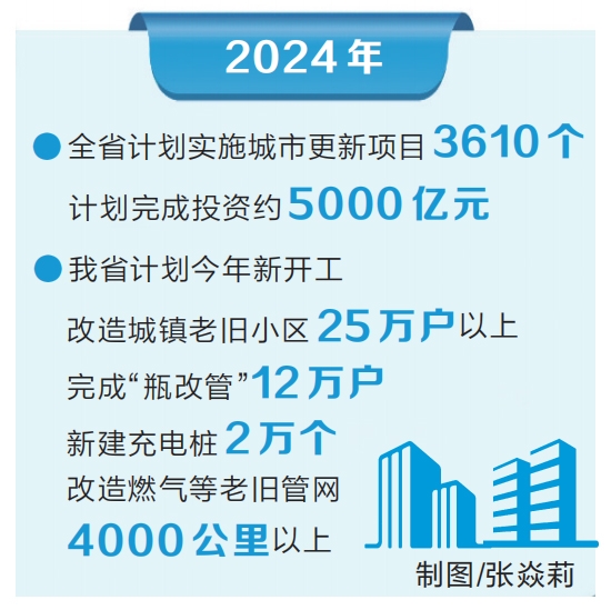 聚焦群眾“急難愁盼”等突出問題,我省堅持項目為王,科學(xué)謀劃實施城市更新項目。針對“一主兩副”重點城市和城市生命線安全工程、老舊小區(qū)改造、地下管網(wǎng)改造等重點領(lǐng)域,完善城市更新項目庫,強化項目監(jiān)測調(diào)度,穩(wěn)步推動項目落地見效。我省計劃今年新開工改造城鎮(zhèn)老舊小區(qū)25萬戶以上、完成“瓶改管”12萬戶、新建充電樁2萬個,改造燃?xì)獾壤吓f管網(wǎng)4000公里以上。