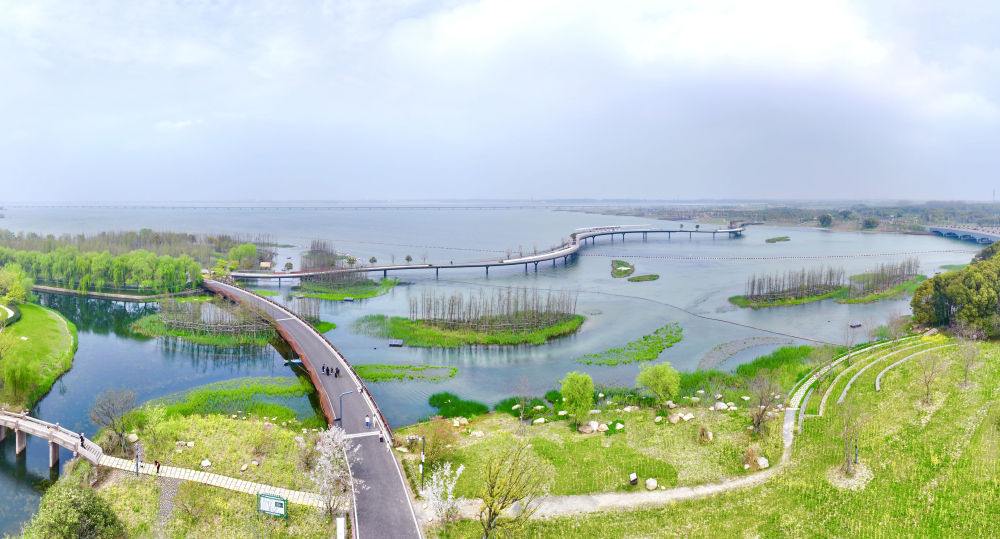 ??這是連接上海青浦和江蘇吳江兩地的元蕩慢行橋(2024年3月31日攝,無人機照片)。漫步橋上,大好風光盡收眼底。同心結(jié)形狀的元蕩慢行橋,是長三角一體化發(fā)展的生動注腳之一。