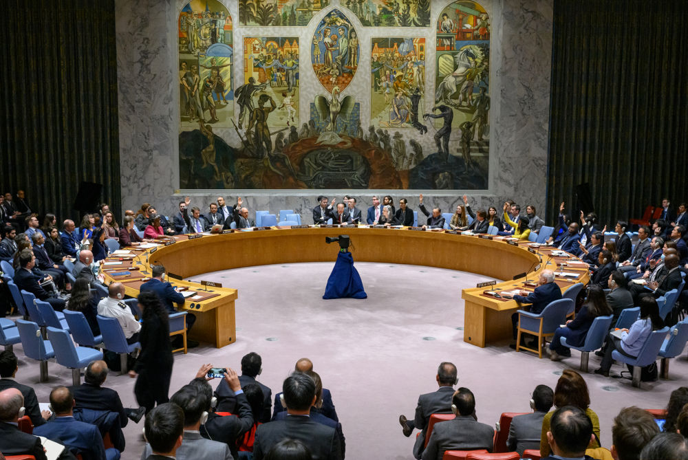 2023年11月15日,在位于紐約的聯(lián)合國總部,安理會(huì)就涉巴以局勢(shì)的決議草案進(jìn)行表決。新華社發(fā)(聯(lián)合國供圖/洛伊·費(fèi)利佩攝)