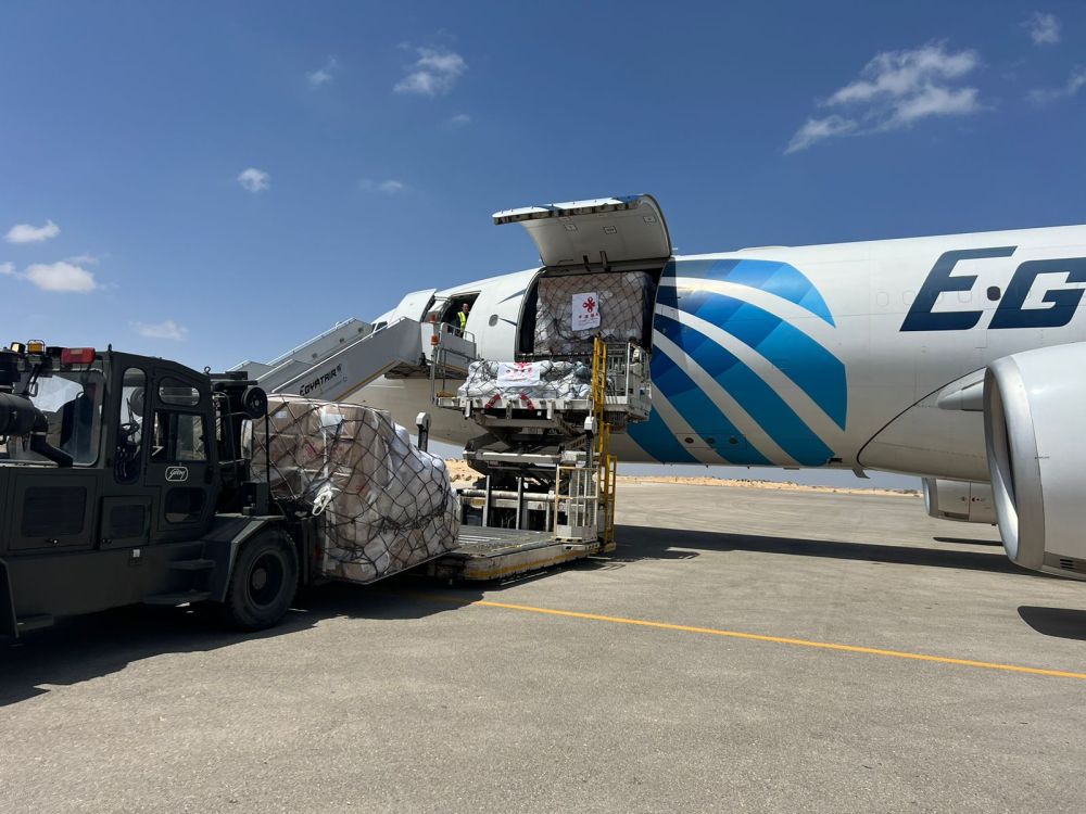 2024年4月19日,工作人員在埃及阿里什機(jī)場(chǎng)卸載中國援助巴勒斯坦的物資。新華社發(fā)