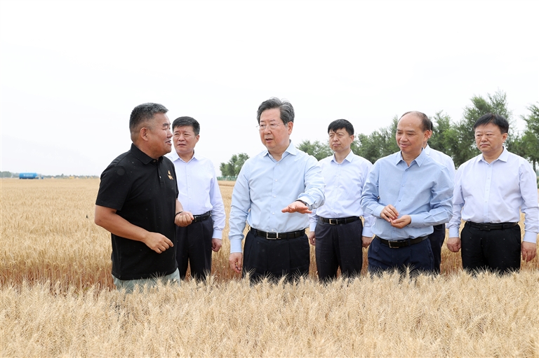 長葛市石象鎮(zhèn)的高標準農田里,金色的麥浪起伏蕩漾,聯合收割機穿梭奔忙,一派燦爛豐盈的喜人景象。樓陽生走進麥田、揉開麥穗,察看麥粒飽滿程度,與農戶、農機手親切交流,了解播種面積、麥收進度、收成收入等。他指出,春爭日、夏爭時,要密切關注天氣變化,搶抓麥收有利窗口期,加強跨區(qū)機收組織調度,提升機械化、智能化水平,確保應收盡收、顆粒歸倉。在河南鼎優(yōu)農業(yè)科技有限公司,樓陽生走進新品種展示中心,了解玉米、瓜果、蔬菜等新品種培育種植情況,鼓勵企業(yè)不僅要培優(yōu)種好新品種,還要往深加工走,拉長產業(yè)鏈、提高附加值。在聽取企業(yè)人才引育情況匯報后,他指出,發(fā)展現代農業(yè)離不開一支高素質農業(yè)從業(yè)者隊伍,要加強產業(yè)扶持、政策支持,培育引導更多愛農業(yè)、有知識、懂技術、善經營的新農人,投身農村廣闊天地大展身手。