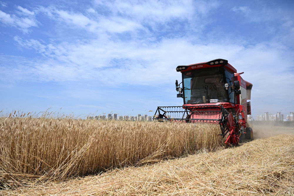 ??2024年5月29日,在安徽省蚌埠市五河縣朱頂鎮(zhèn)淮河岸邊,農(nóng)機(jī)手駕駛收割機(jī)收割小麥。新華社記者 黃博涵 攝