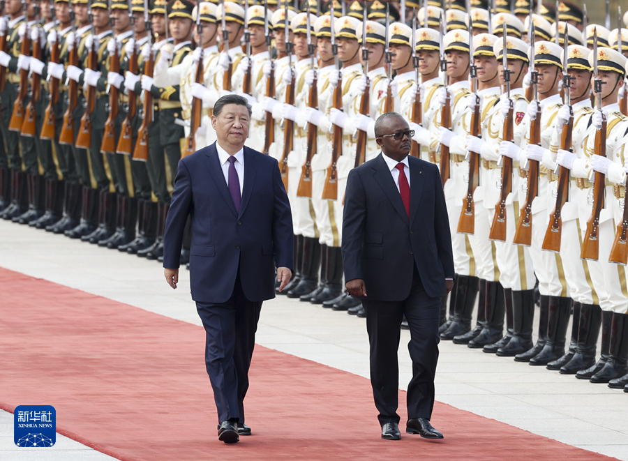 ??恩巴洛抵達(dá)時,禮兵列隊致敬。兩國元首登上檢閱臺,軍樂團(tuán)奏中國和幾內(nèi)亞比紹兩國國歌,天安門廣場鳴放21響禮炮。恩巴洛在習(xí)近平陪同下檢閱中國人民解放軍儀仗隊,并觀看分列式。