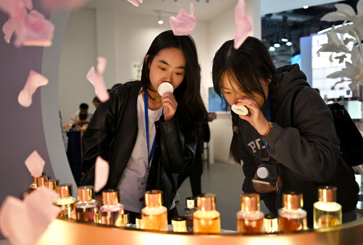 ??11月9日,觀眾在第七屆進(jìn)博會歐萊雅展臺試聞香水。新華社發(fā)(陳浩明 攝)
